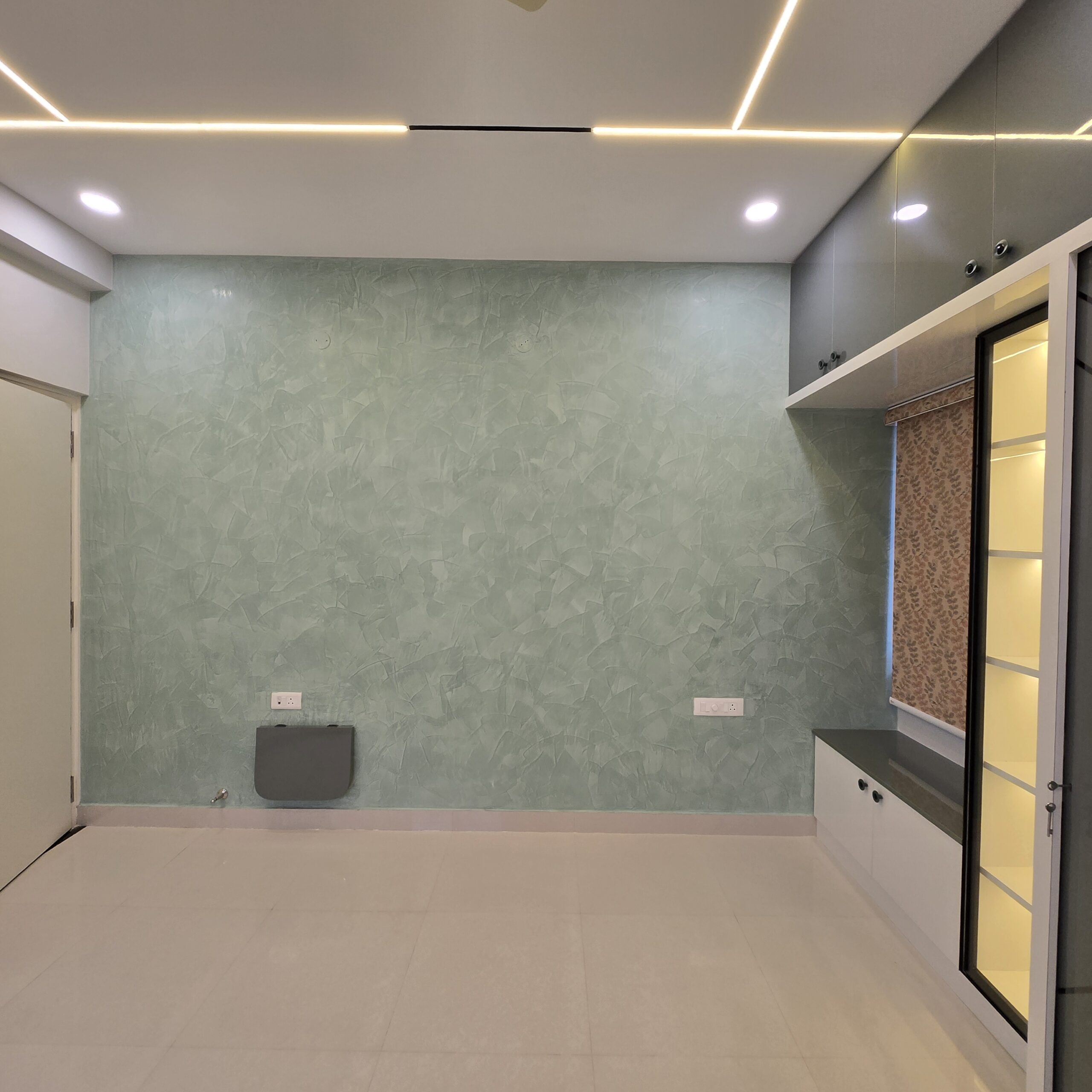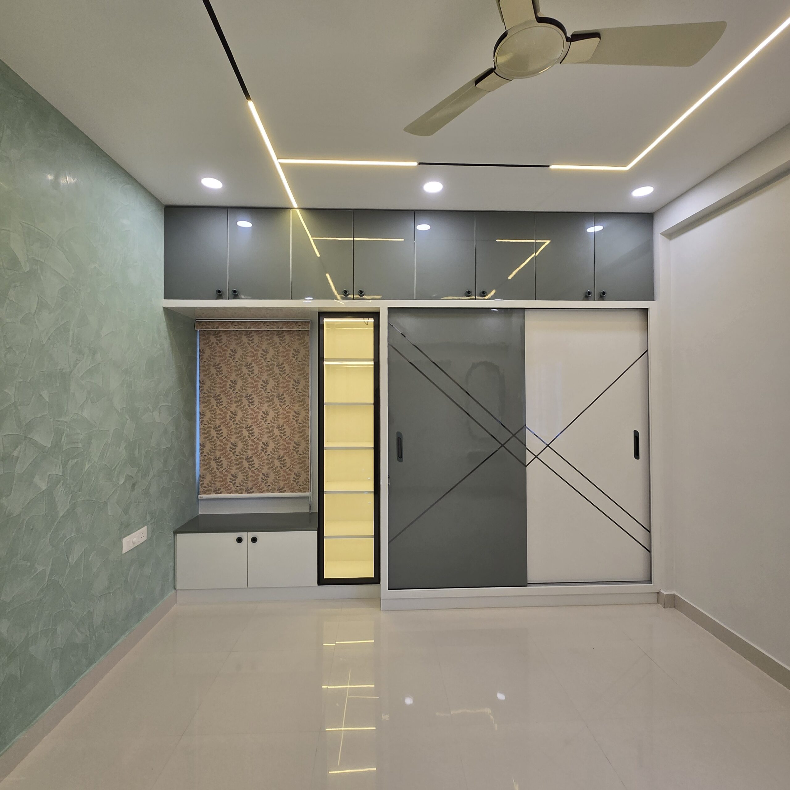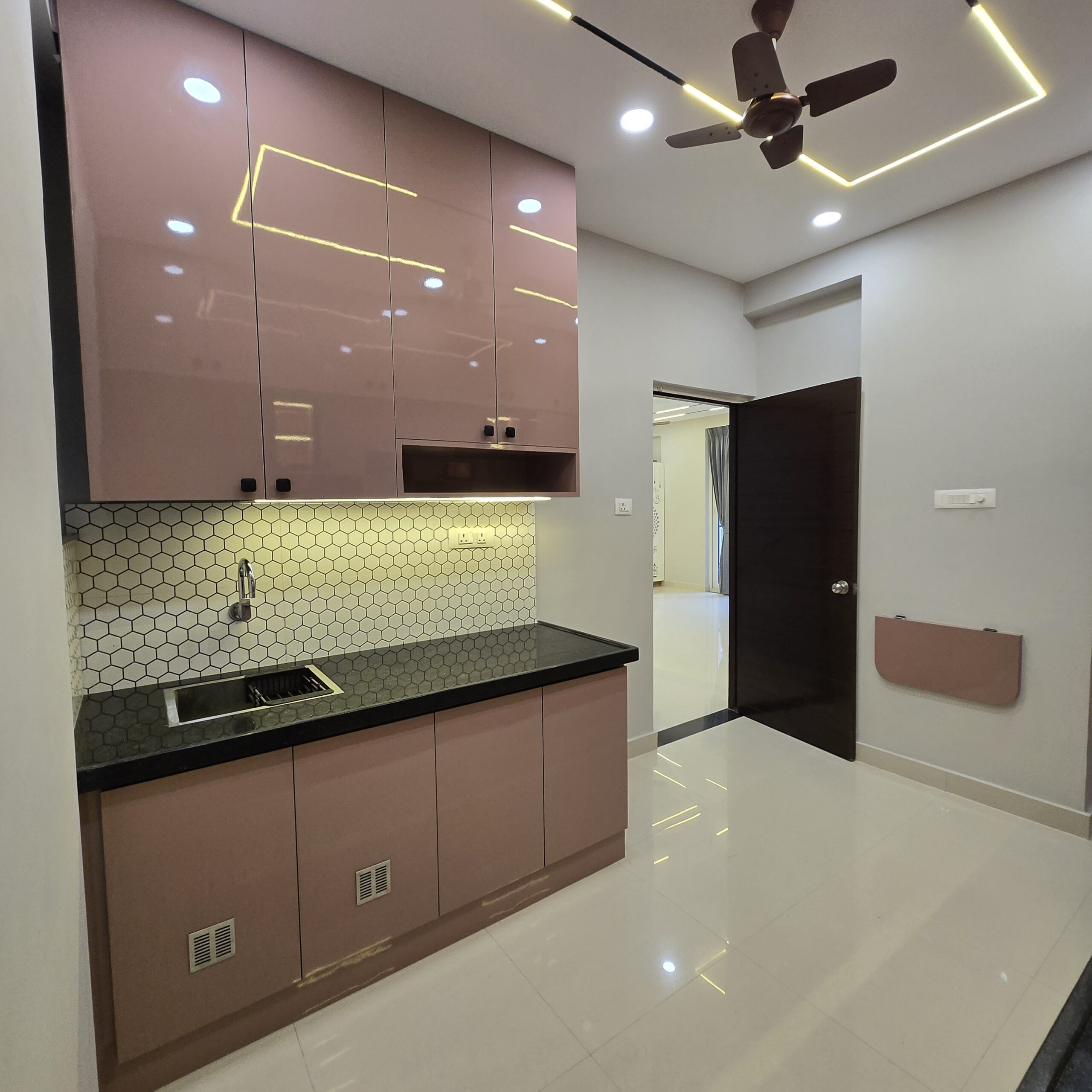 SMR Vinay Boulder Woods, Bandlaguda Jagir, presents a 3BHK modern home interior design crafted with modern style and useful planning. The kitchen combines pastel cabinets with dark counters for a smart look. A striking blue wall panel in the living room is matched with soft ceiling lights for a warm vibe. White finishes and wood textures keep the home elegant, while the golden pooja unit adds tradition. This 3BHK modern home interior design makes every corner practical, stylish, and family-friendly.