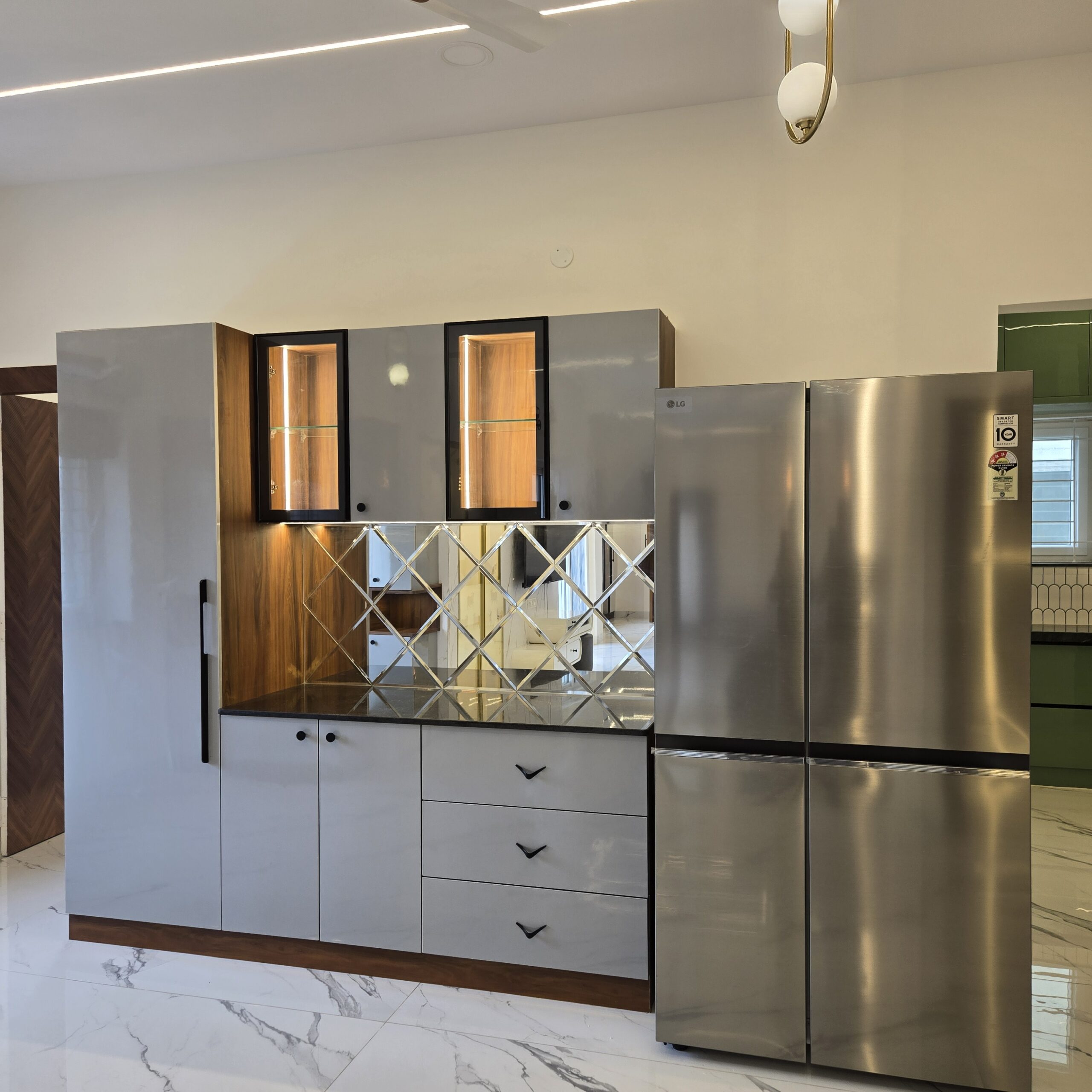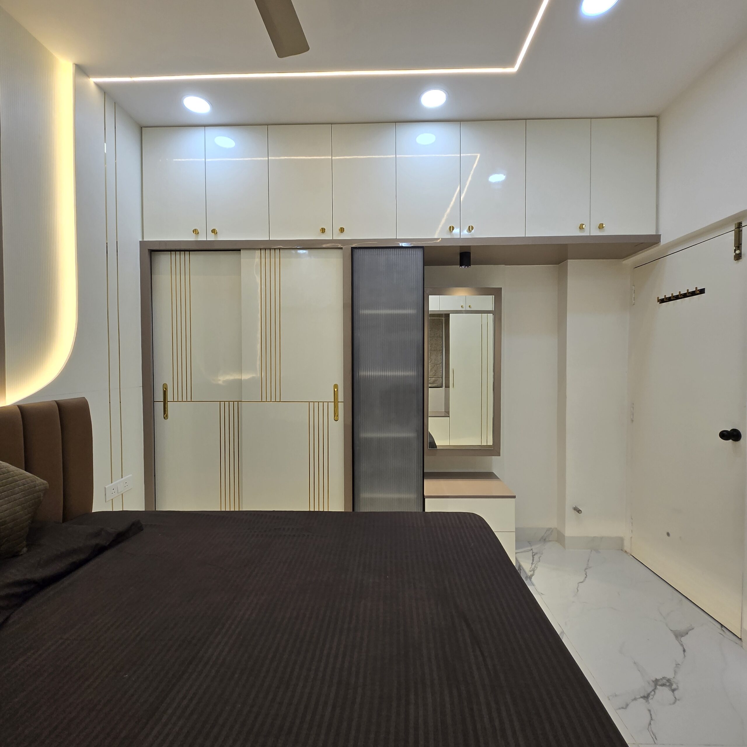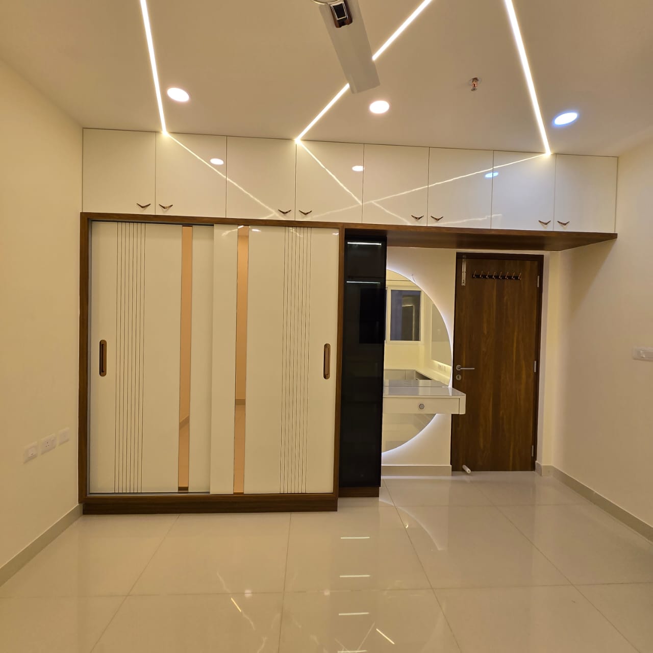 Stylish and comfortable 3BHK modern home interior design at Himayatnagar reflects smart planning and elegant details. The modular kitchen in soothing green shades with black counters brings a fresh and functional look. The living room features sleek finishes, bright lighting, and spacious layouts for family comfort. A beautifully designed pooja unit with golden accents adds a traditional touch. Each corner of this 3BHK modern home interior design is thoughtfully created to balance beauty, function, and everyday living needs.